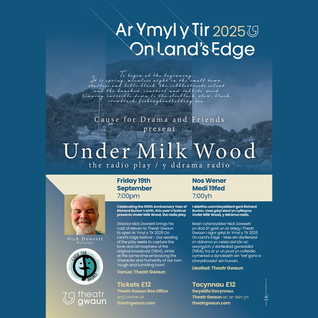 Mae’r cyfarwyddwr Nick Dowsett yn dod â’i gast un ar ddeg i Theatr Gwaun i agor gŵyl Ar Ymyl y Tir 2025 On Land’s Edge – Mae deialog ddisglair a naratif cyfoethog Dylan Thomas yn disgrifio pedair awr ar hugain o brofiad dynol mewn tref glan môr fach yng Nghymru. Disgrifiodd Thomas ei hun y ddrama fel ‘rhyddiaith gyda phwysedd gwaed.’